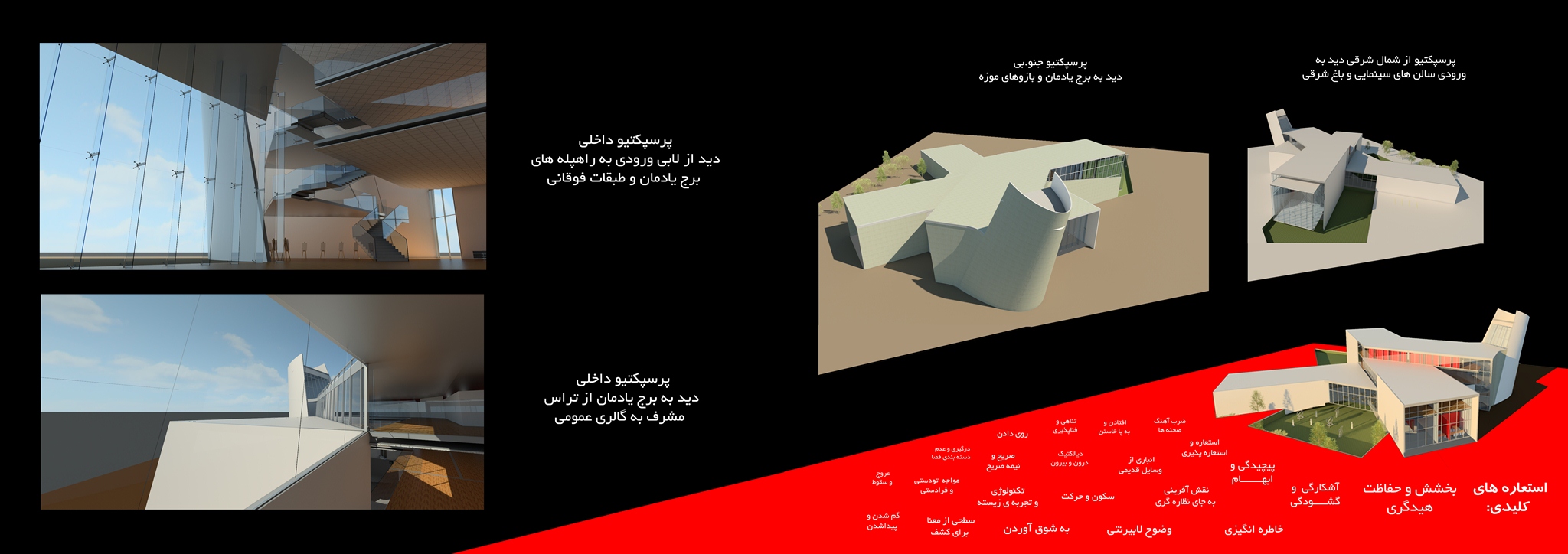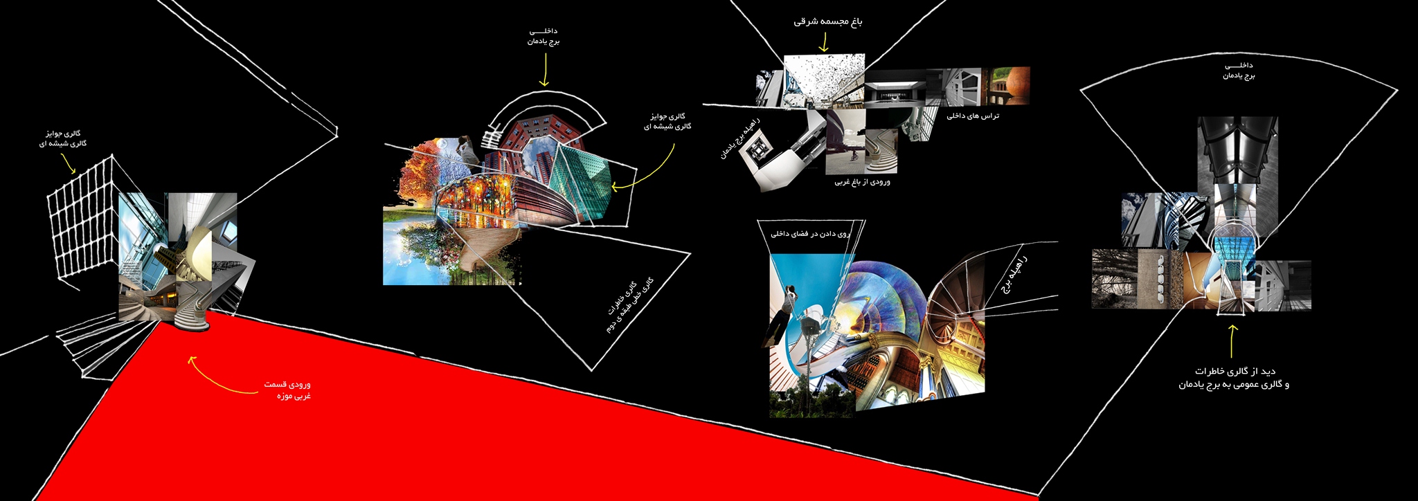 2-تکه انگار ی یک تجربه ی جدید : که شامل شرح و توضیح روش طراحی (فرایند طراحی) به کار گرفته شده است. و به نوعی تجربه ی عملی و شرح مشکلات و راه حل هایی که در مورد استفاده از روش طراحی کلاژ توی معماری هست رو توضیح دادم. (میتونید برای اشنایی بیشتر به این پست ها سری بزنین: